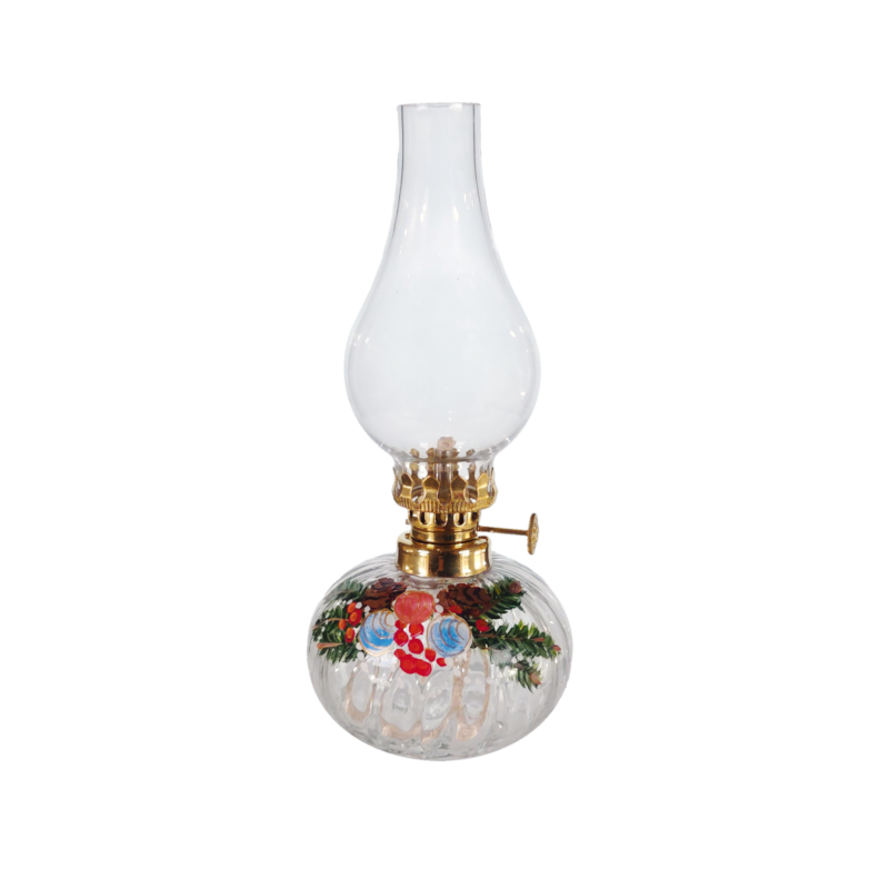 Lampa naftowa składająca się z mosiężnej oprawy, kominka oraz pojemnika na naftę z knotem. Klosze wykonane ręcznie z niezwykłą starannością z wysokiej jakości szkła jasnego. Jest fabrycznie nowy, pochodzi prosto od producenta.