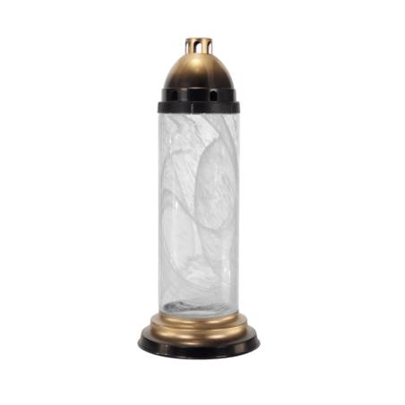 Znicz wykonany ze szkła jasnego zdobionego z kapturkami wykonanymi w tworzywa.