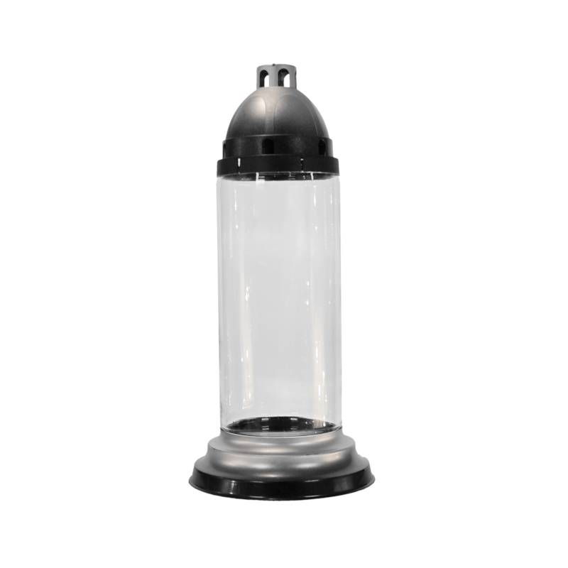 Svíčka na hrob z čirého skla s víčky a podstavci z plastu.