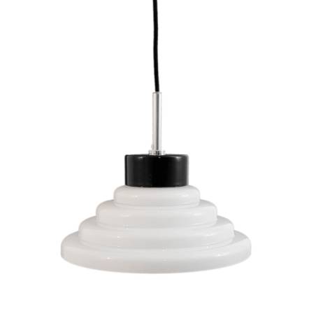 Stínidlo je ručně vyrobené s velkou pečlivostí z kvalitního třívrstvého opálového skla (bílé). Popruh viditelný na fotografii je připevněn ke stínidlu. Je nový, přímo od výrobce.