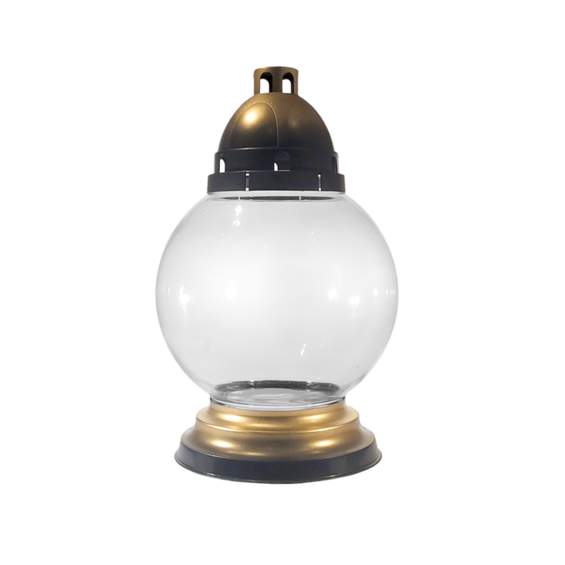 Grablampe aus hellem Glas, Windschutz und Sockel aus Kunststoff.