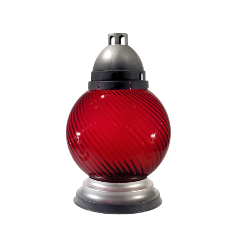 Grablampe aus hellem Glas verziert, Windschutz und Sockel aus Kunststoff.