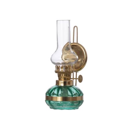 Eine Petroleumlampe bestehend aus einer Messingbefestigung, einem Lampenschirmen (Kamin) und einem Petroleumbehälter mit Docht. Mit äußerster Sorgfalt von Hand gefertigte Lampenschirme aus hochwertigem Klarglass.