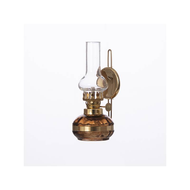 Eine Petroleumlampe bestehend aus einer Messingbefestigung, einem Lampenschirmen (Kamin) und einem Petroleumbehälter mit Docht. Mit äußerster Sorgfalt von Hand gefertigte Lampenschirme aus hochwertigem Klarglass.