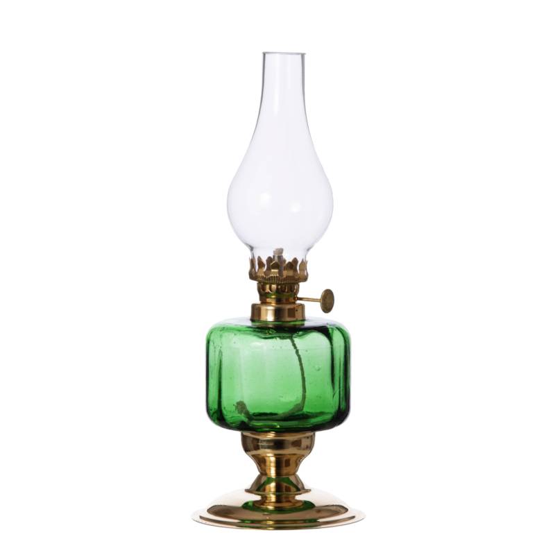 Eine Petroleumlampe bestehend aus einer Messingbefestigung, einem Lampenschirmen (Kamin) und einem Petroleumbehälter mit Docht. Mit äußerster Sorgfalt von Hand gefertigte Lampenschirme aus hochwertigem Klarglass.