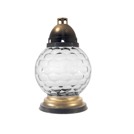 A hand crafted gravelight made of light glass decorated. Base and cup are made of synthetic polimers.