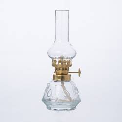 Lampa naftowa składająca się z mosiężnej oprawy, kominka oraz pojemnika na naftę z knotem. Klosze wykonane ręcznie z niezwykłą starannością z wysokiej jakości szkła jasnego. Jest fabrycznie nowy, pochodzi prosto od producenta.