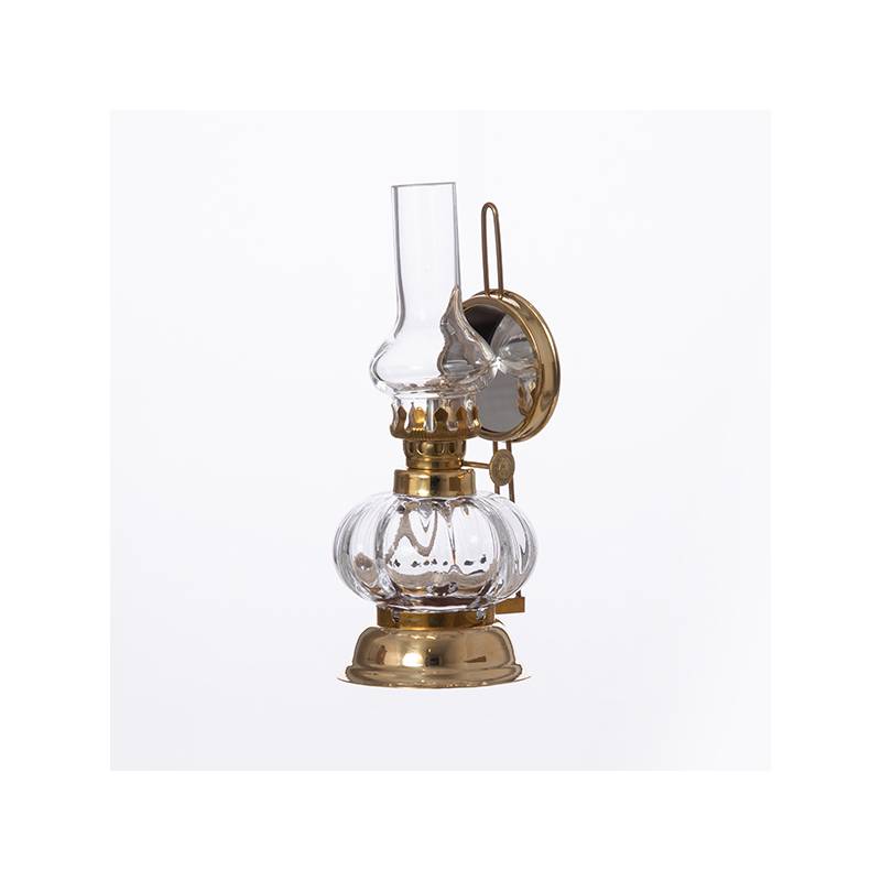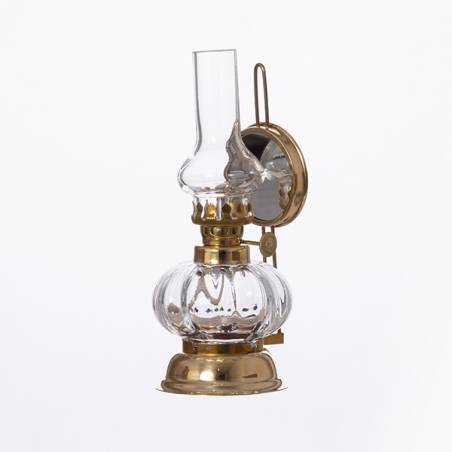 Lampa naftowa składająca się z mosiężnej oprawy oraz pojemnika na naftę z knotem. Klosz wykonany ręcznie z niezwykłą starannością z wysokiej jakości szkła jasnego. Towar wygląda dokładnie tak, jak na zdjęciu. Jest fabrycznie nowy, pochodzi prosto od producenta.