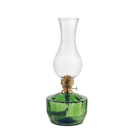 Lampa naftowa składająca się z mosiężnej oprawy, kominka oraz pojemnika na naftę z knotem. Klosze wykonane ręcznie z niezwykłą starannością z wysokiej jakości szkła jasnego. Jest fabrycznie nowy, pochodzi prosto od producenta.