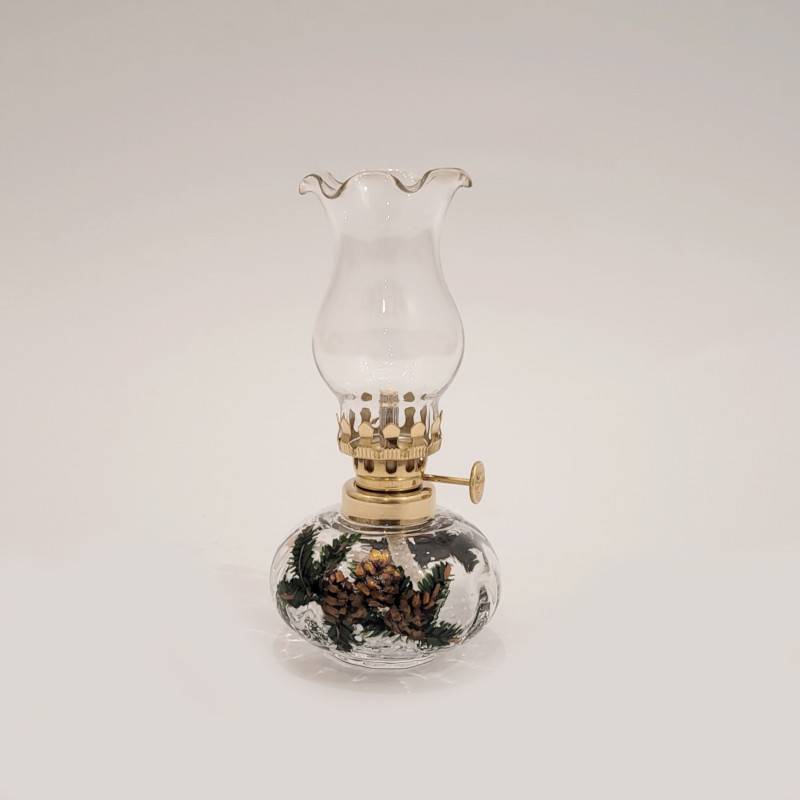 Lampa naftowa składająca się z mosiężnej oprawy, kominka oraz pojemnika na naftę z knotem. Klosze wykonane ręcznie z niezwykłą starannością z wysokiej jakości szkła jasnego. Jest fabrycznie nowy, pochodzi prosto od producenta.